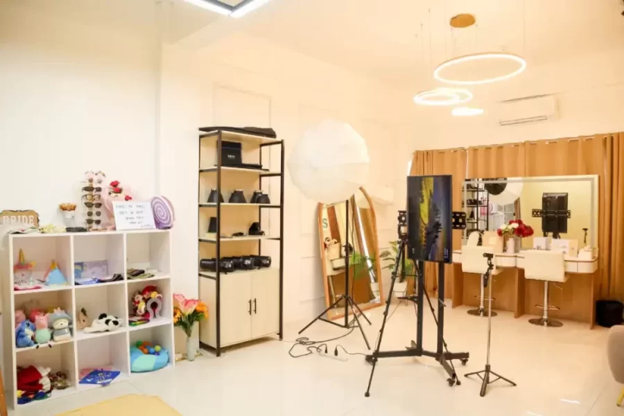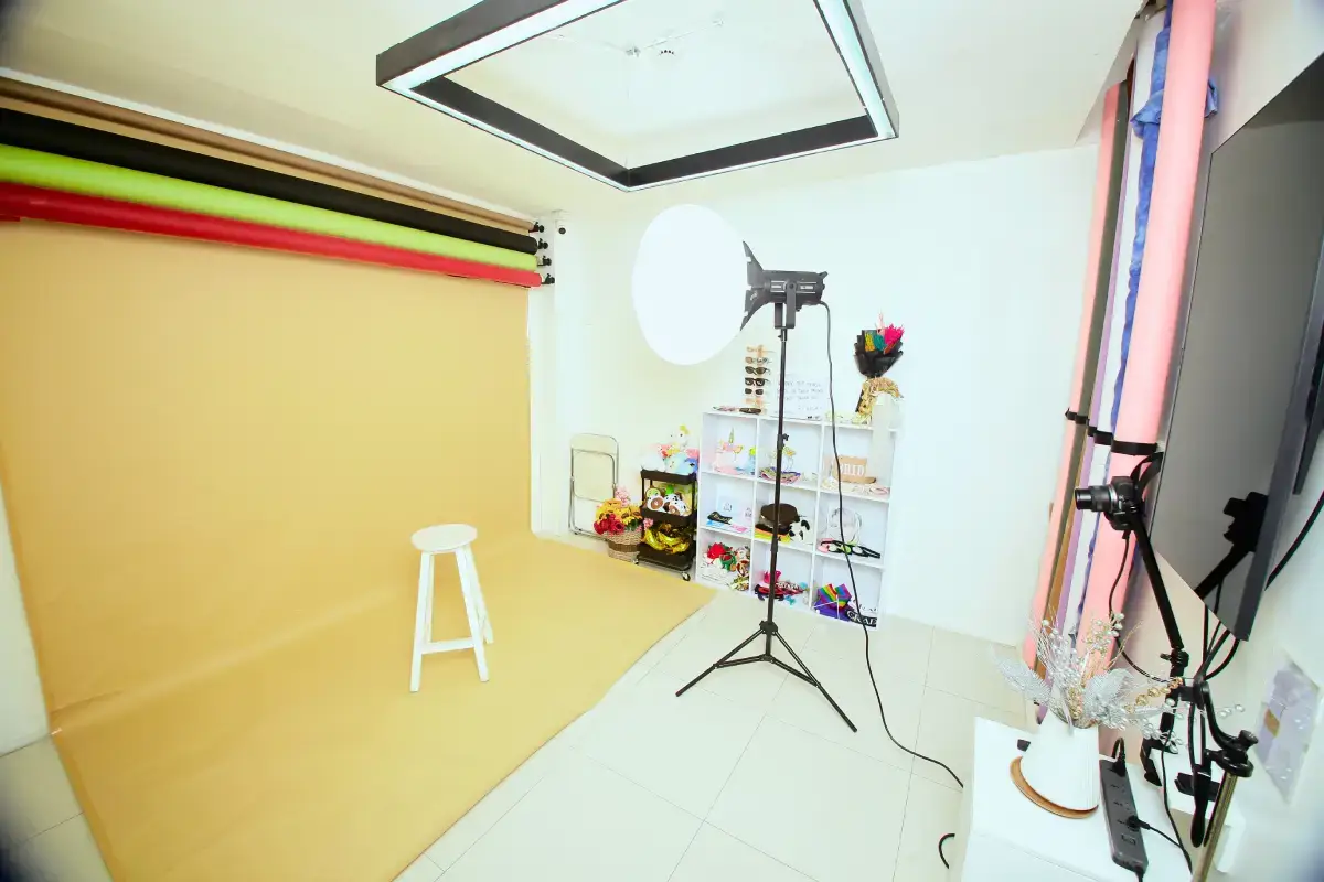 Bring your creative vision to life in our spacious studio, complete with props, vanity area, and dressing room. Perfect for photographers, content creators, and teams — with optional add-ons for cameras, lighting, and more to suit your needs.